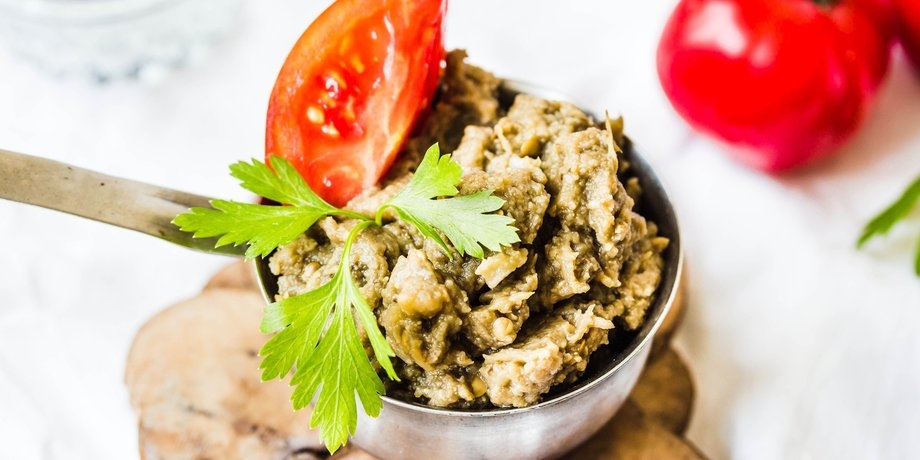 Бабагануш — восточная и невероятно вкусная закуска. Команда Mitzva Bar поделилась с нами своим рецептом. Сначала нужно запечь баклажаны и сделать домашнюю тхину, а потом все ингредиенты просто смешать.