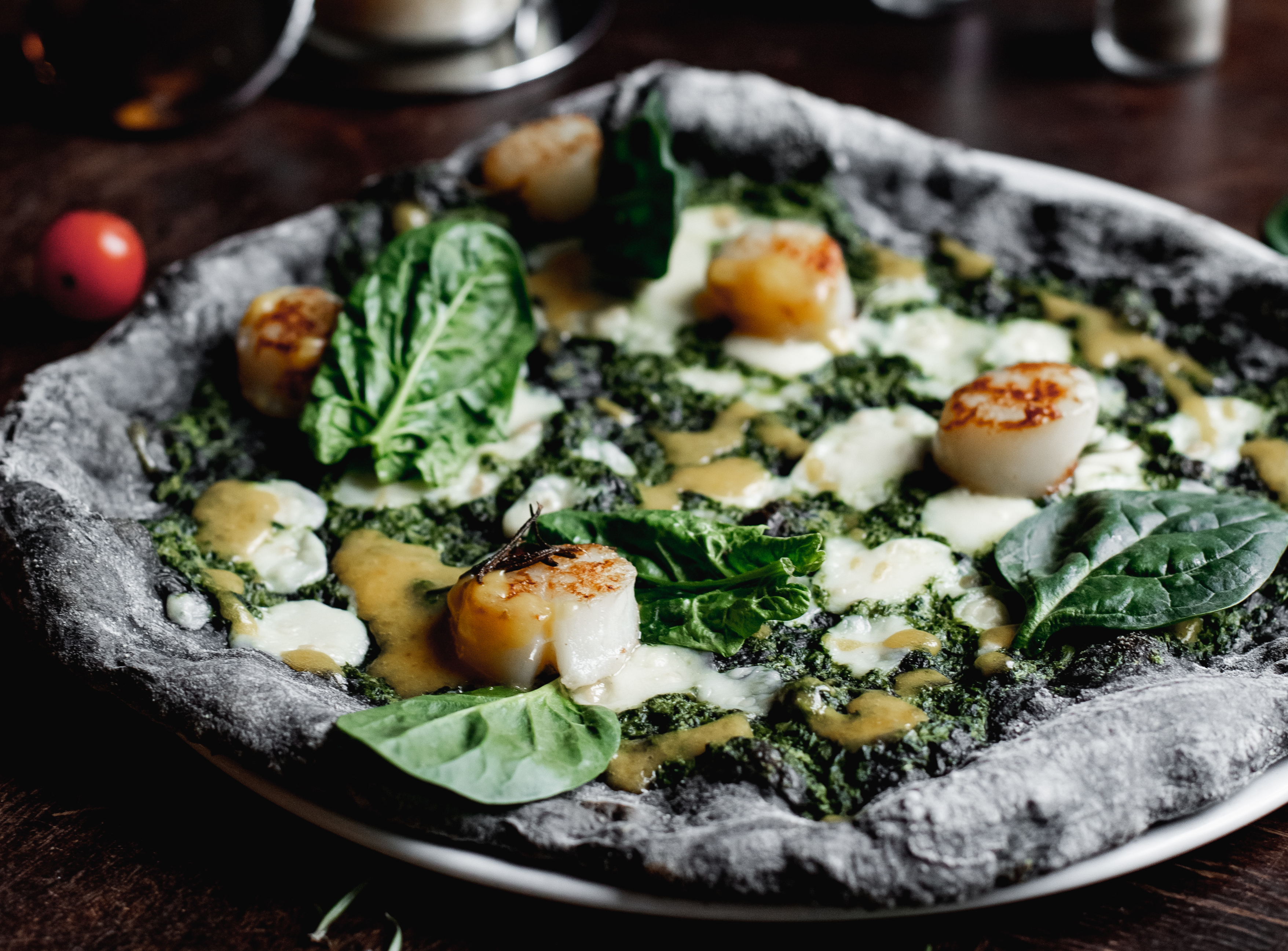 Ржаная с кальмарами. Во-первых, удивительна она цветом теста. Всегда интересно наблюдать за реакцией гостей, когда они спрашивают, почему пицца черная. Мы добавляем в нее ржаную муку, которая и придает пицце такой оттенок. Во-вторых, представьте, бородинская пицца с кальмарами, шпинатом и пармезаном. Звучит необычно, но только это еще и вкусно.
