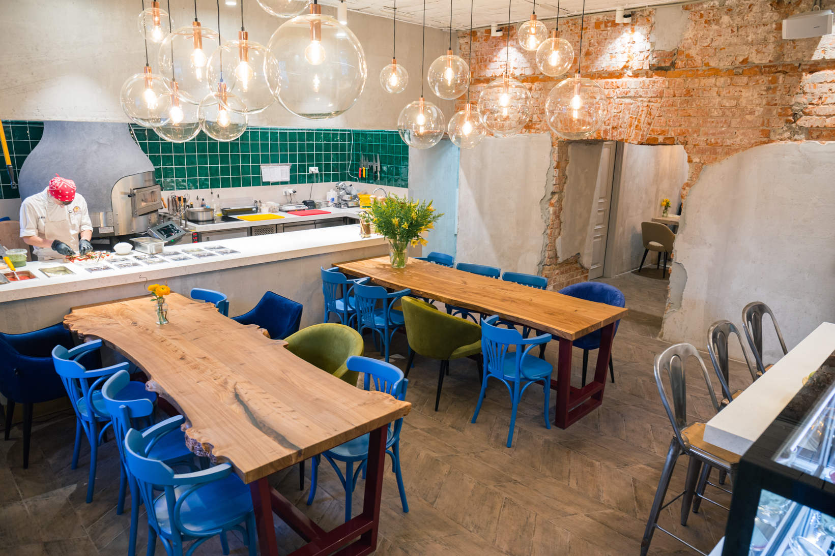 Мы делаем римскую пиццу, которая только пришла на рынок, и о ней мало кто знает, для многих — это непривычный формат. У нас есть, конечно, традиционно итальянские пиццы, но большая часть меню — разнообразные авторские начинки. Мы экспериментируем: карпаччо из говядины с карамелизированной сливой и халапеньо, маринованные креветки с бурратой.